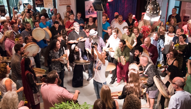 This is the 20th time we have had the pleasure of announcing this special evening at the Tamburi Mundi Festival: The Tamburi Mundi Special “Gala”, at which the festival and (almost) all participants present themselves, is now a firm tradition and the heart of the festival. An evening of percussion that could hardly be more musically contrasting, more colorful or more diverse. An evening on which the most diverse facets of the frame drum world come together: Drummers from Japan, Spain, Tajikistan, Italy, Ukraine, Poland, Belgium, Algeria, Turkey, Iran, Israel, the USA and Germany bring their rhythms and compositions with them.