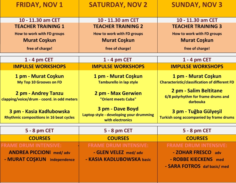 In diesem Workshop werden wir die wichtigsten Rhythmen und Maqame (traditionelle persische Rhythmen) für Daf durchgehen und uns auf die Verbesserung eurer Spieltechnik konzentrieren. Außerdem arbeiten wir an Variationen und zusätzlichen Kombinationen.
